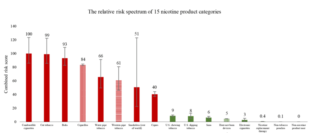 Studien rangordnar produkterna på en riskskala från 0 till 100, där cigaretter står som mest riskfyllda. Här är några centrala resultat:
